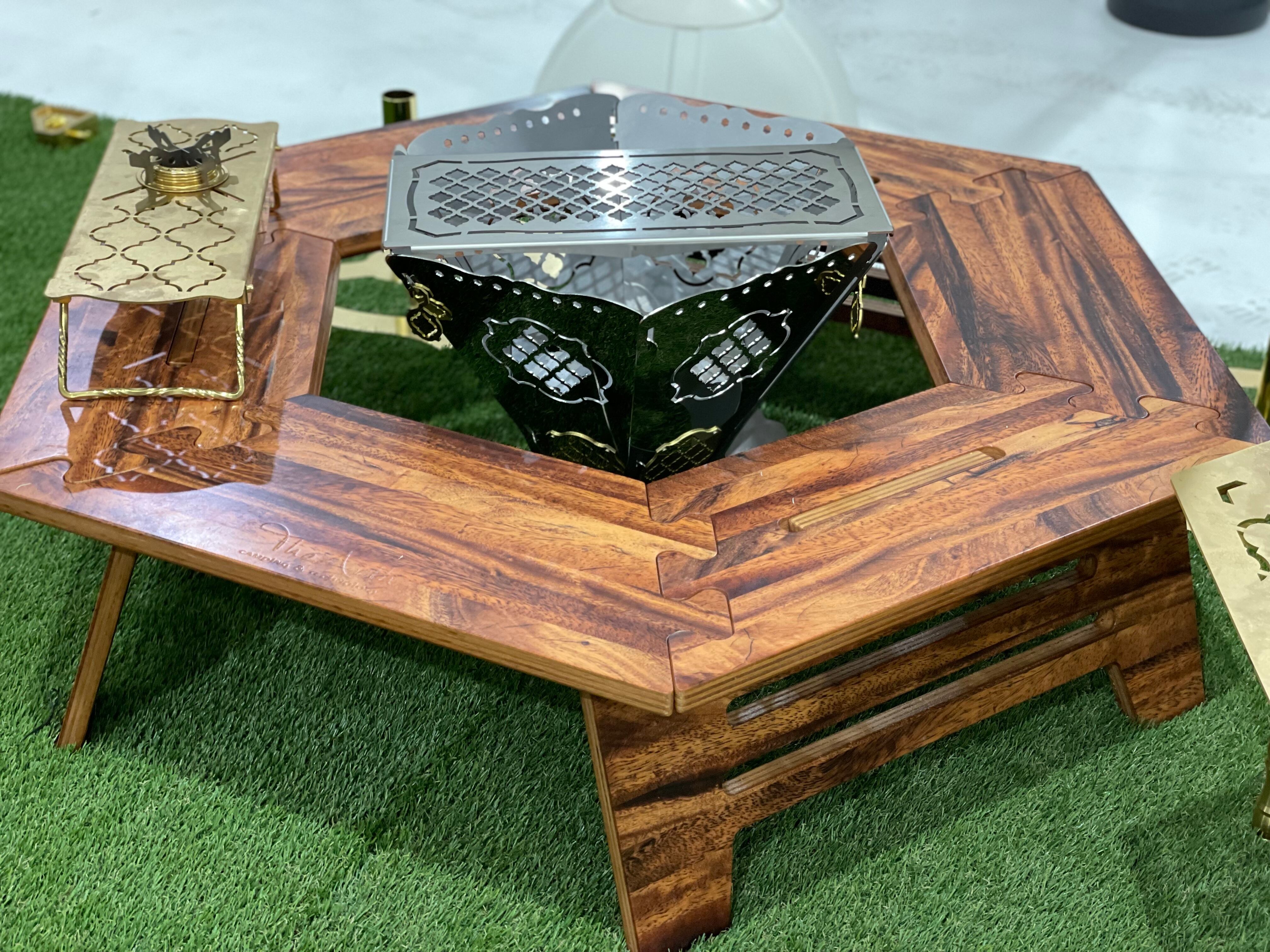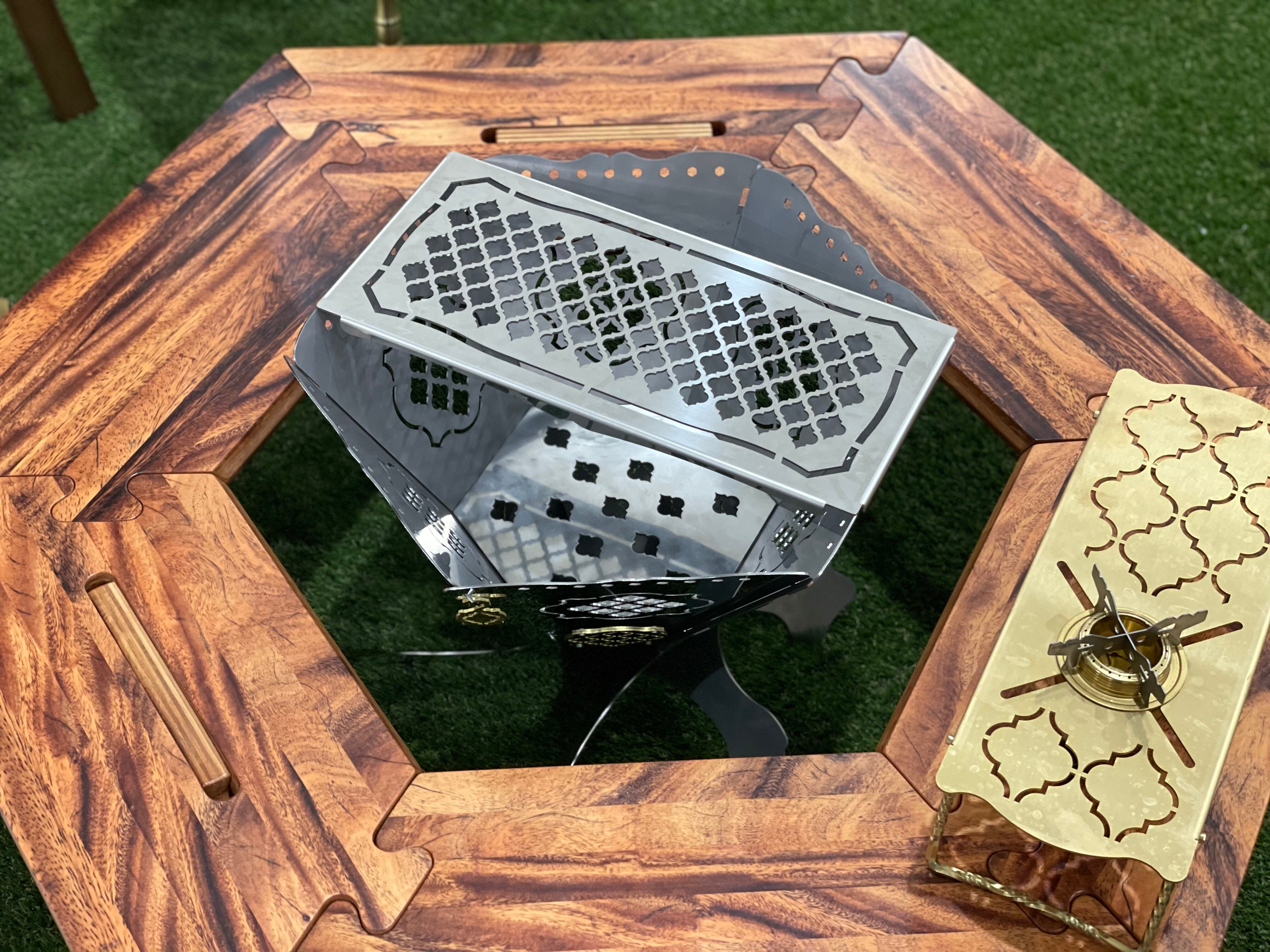 ありそうで無かったレトロデザインのヘキサ型焚火台! メイン材質のステンレスに加え各所に真鍮パーツを組合せる事で美しい輝きとゴージャスさを醸し出します。